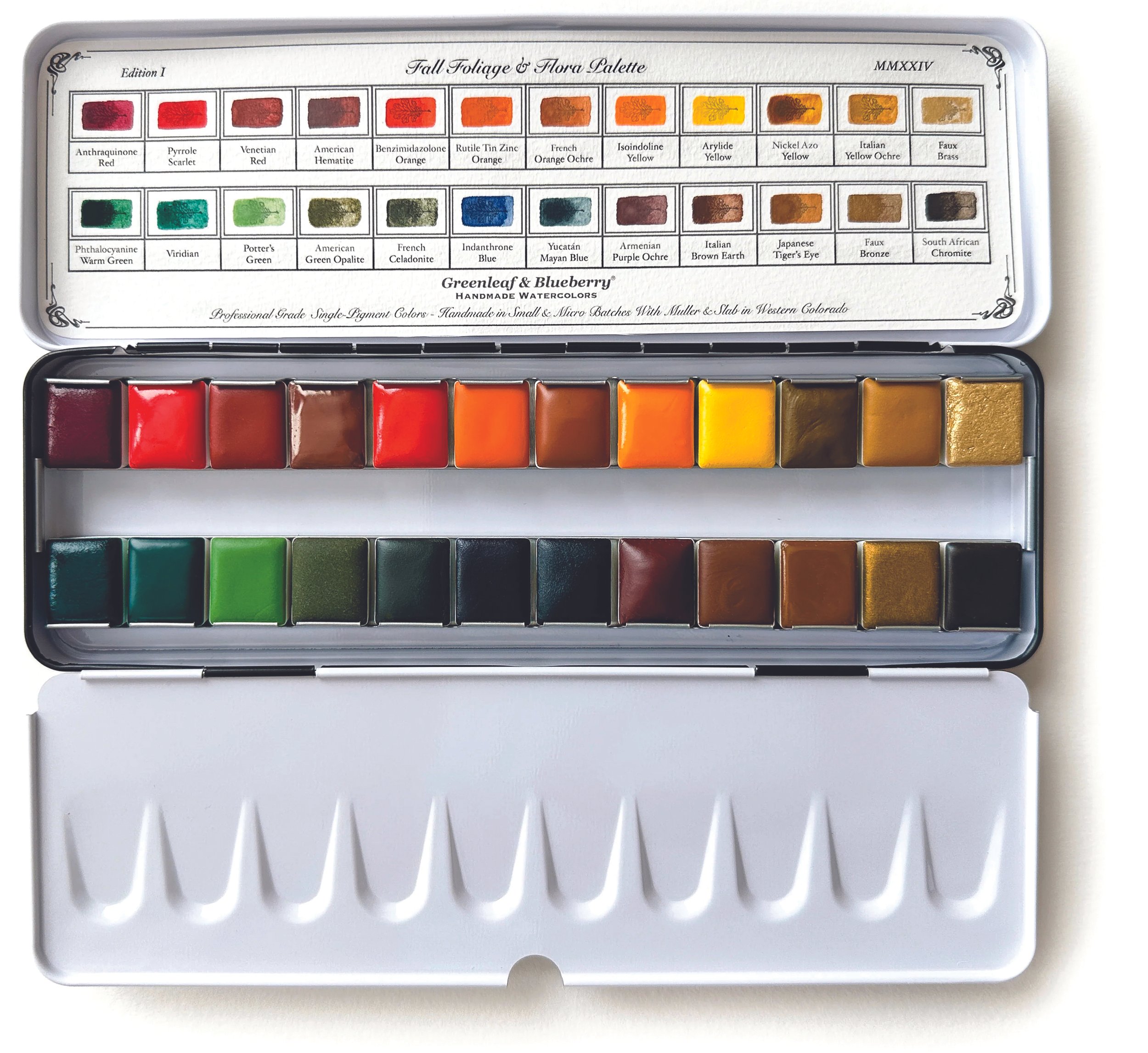 The changing foliage and calming cool of fall reflect a particularly perfect time to bring paintbrush to paper. Greenleaf specifically designed the Fall Flora & Foliage Palette, comprised of 24 colors and accompanied by a hand-painted color chart for the fall season. She selected these colors specifically for depicting fall leaves, foliage and all plants in their seasonal state. Choose among a full array of reds, oranges, yellows, greens and browns, with a couple blues to choose from for mixing and versatility.