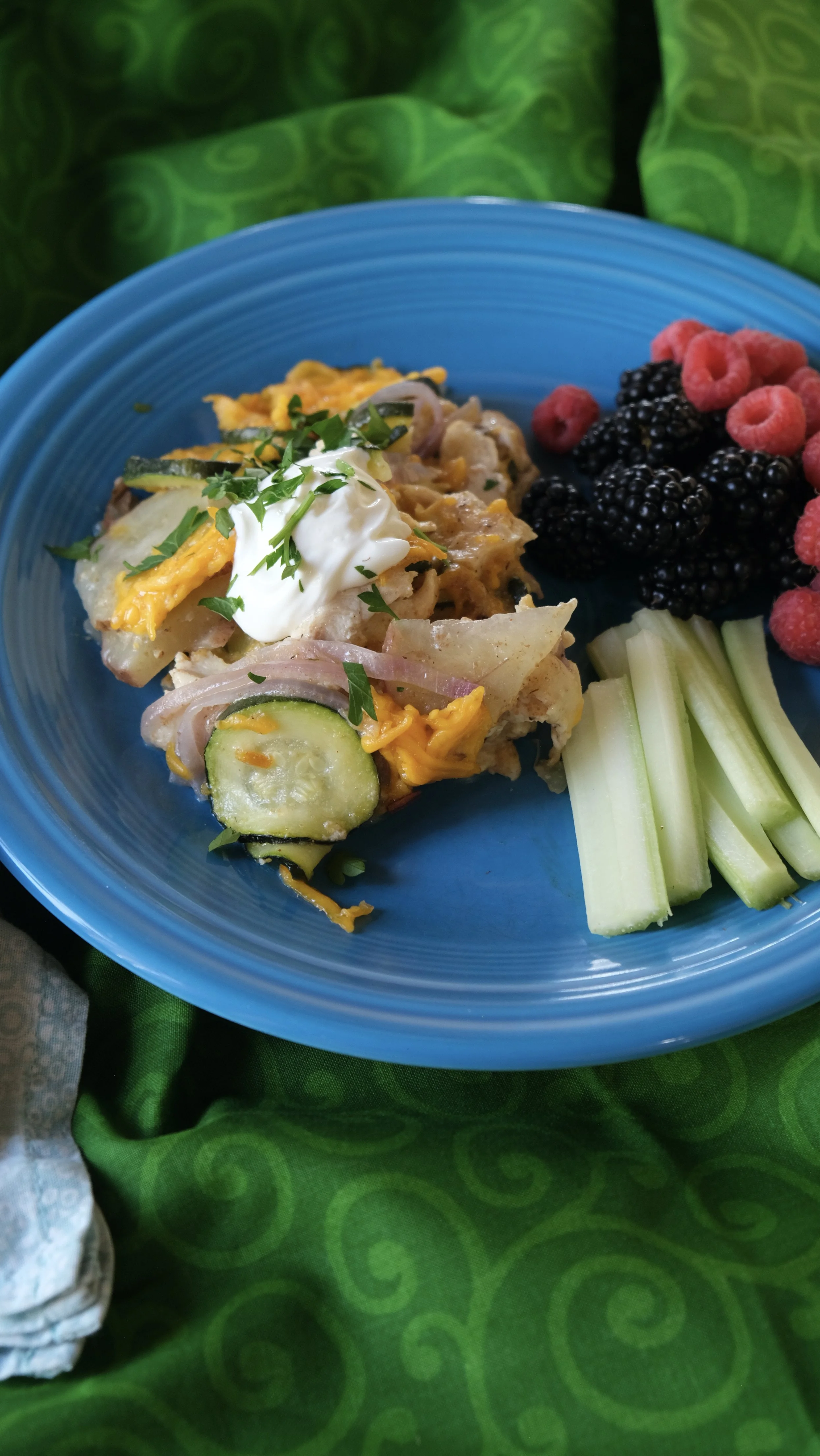 5. Beginning with potatoes, layer the potatoes, onion, zucchini, optional chicken and cheese.