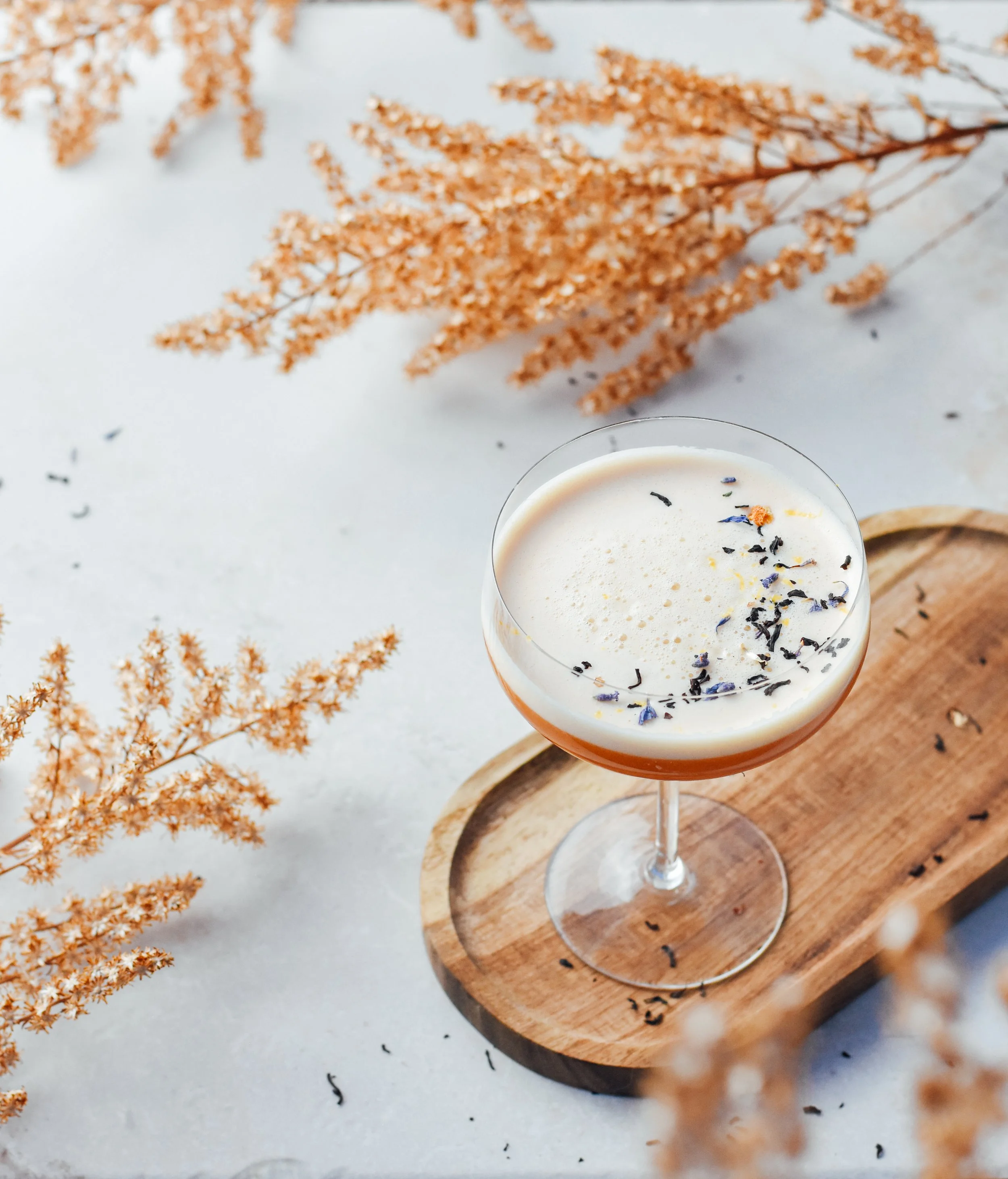 This gin-based cocktail is an aromatic, textural celebration of spring’s arrival. An Earl Grey tea-infused gin dials up complementary tannins and brings out the spirit’s citrus tones, while a lavender honey syrup adds a rich, floral note. Although the eye-catching botanical garnishes are not necessarily meant to be consumed, they do add a decidedly fun crunch and offer olfactory clues to the flavor profile of the cocktail, encouraging the drinker to slow down and savor.